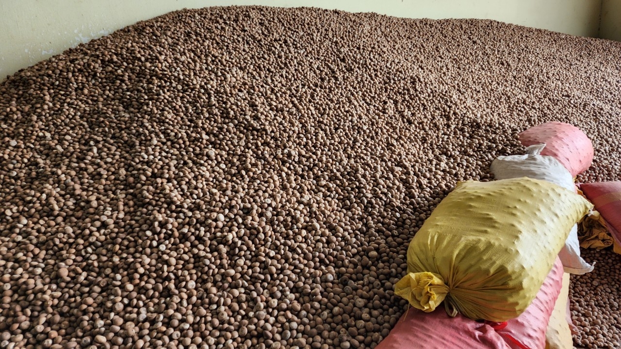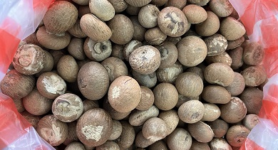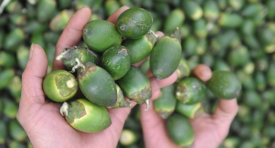 Betel nut is the small fruit of the areca palm, so it is also called areca nut. It is commercially available in dried, cured, and fresh forms. While fresh, the husk is green and the nut inside is so soft that it can easily be cut with an average knife.