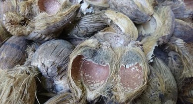 In the ripe fruit the husk becomes yellow or orange and, as it dries, the fruit inside hardens to a wood-like consistency. At that stage the areca nut can only be sliced using a special scissor-like cutter.