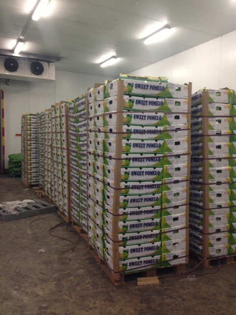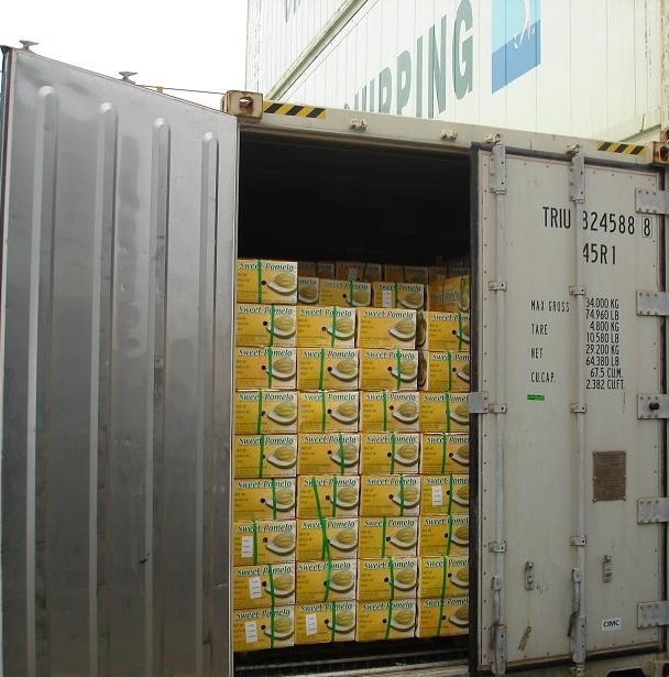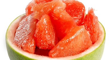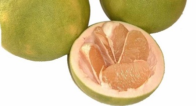 Pomelo (or Chinese grapefruit) is a member citrus family. It comes in pink or yellow varieties when ripe, is somewhat like a large grapefruit, but much sweeter in flavour and with much less bitterness.