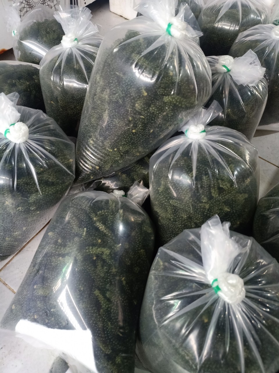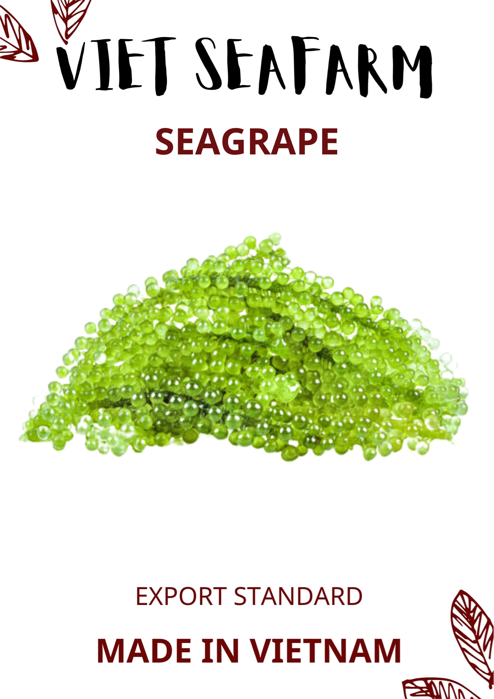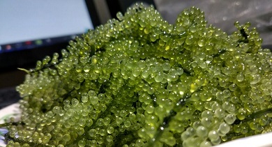 "Seagrapes" also known as green caviar, is a collective term for the edible varieties of the green seaweed genus Caulerpa. The name “sea grapes” comes from the appearance of this seaweed variety; it looks like tiny clusters of green grapes.The edible bubbles are technically the leafy part of the seaweed, and they grow on a long edible stem. Caulerpa lentillifera as its scientific name is one of the favored species due to its soft and succulent texture. It is usually eaten raw with vinegar, as a snack or in a salad.