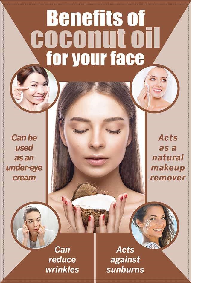 • Moisturize: Using coconut oil is a great way to moisturize your skin, especially if you have dry or damaged skin. Additionally, coconut oil is also the main ingredient in many lip balms, providing some sun protection.